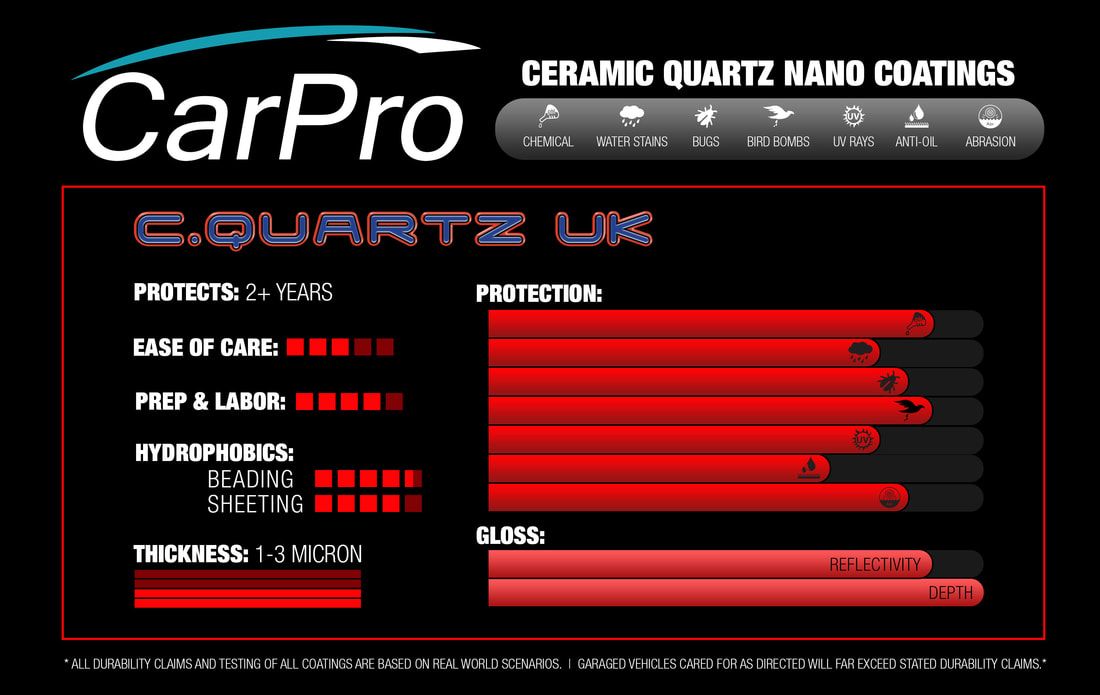 CQuartz Professional is a professionally applied, extremely durable, high gloss coating, providing enhancement and years of protection for your cars, motorycles, RVs, and boats! CQuartz Professional is the latest formula from CarPro, the leader in nanotech car care! Based on the cutting edge innovations of CQuartz over the past decade, their latest formula is infused with an advanced fluorocarbon composite and SiO2 (quartz), with modified nanoparticles to provide an extremely reflective shine and deep, rich gloss that lasts for years!